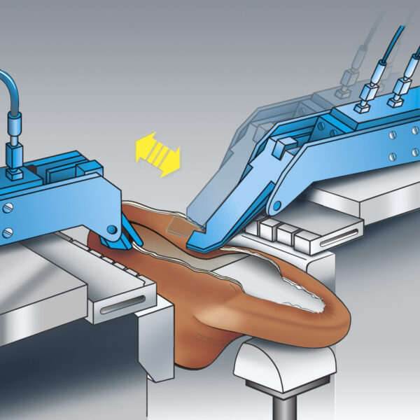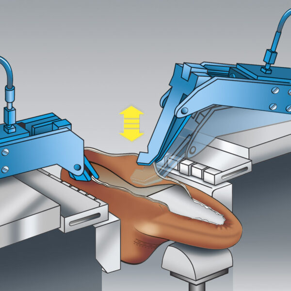 Due pinze, a lato della forma, per il tiraggio della tomaia sia automatico che manuale ed indipendente destro sinistro